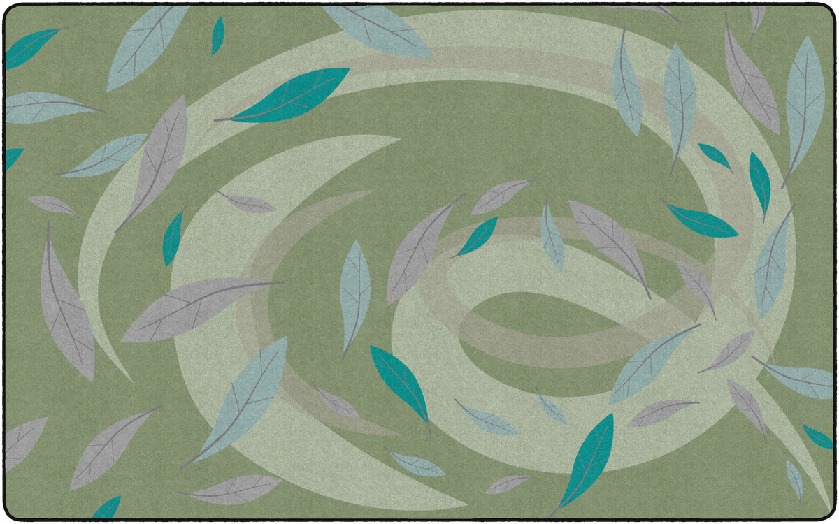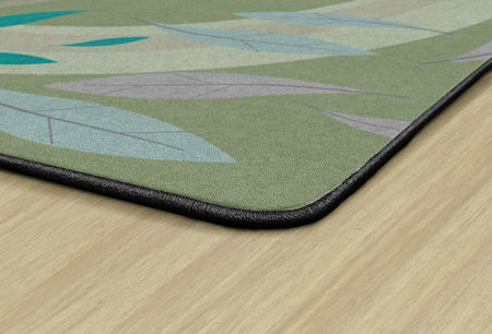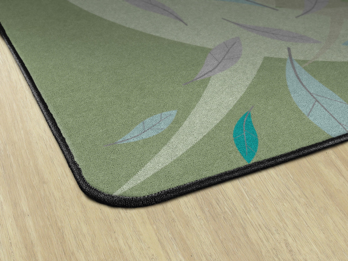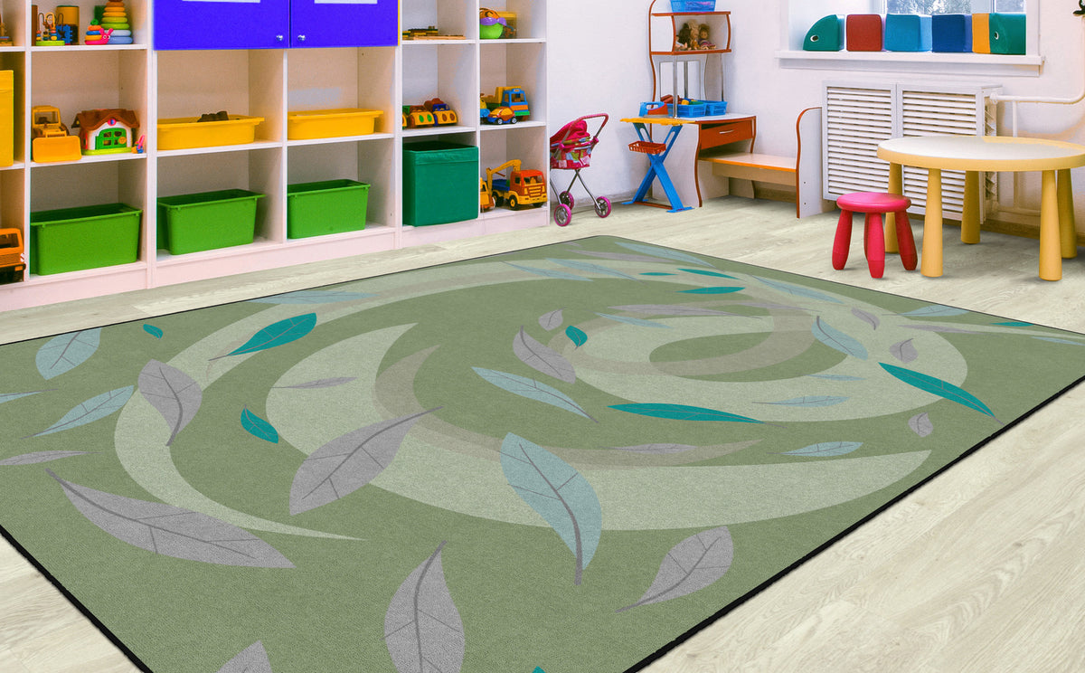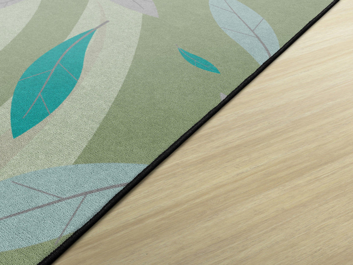 This rug features a gentle swirl of earthy green tones accented by soft blue and purple leaves drifting across a green background. Its calm, nature-inspired design brings a soothing atmosphere to the classroom, perfect for early learners.