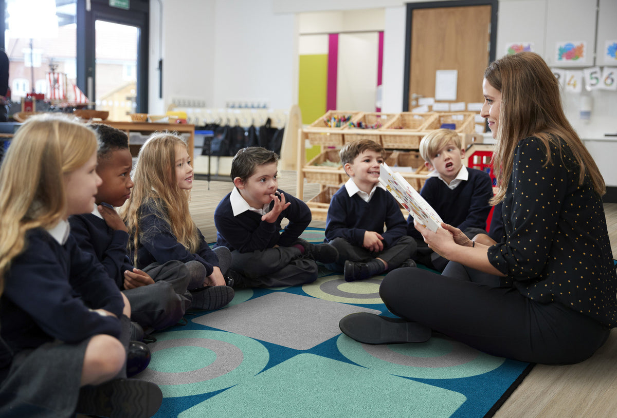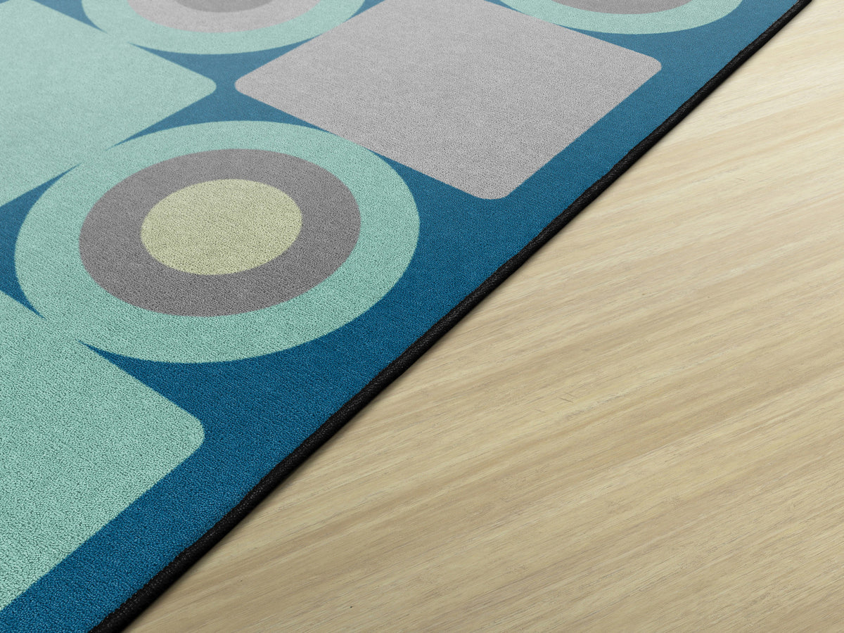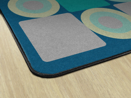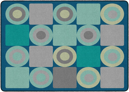 This classroom rug features a playful grid of alternating squares and circles in calming shades of teal, grey, and soft yellow. The modern geometric pattern adds a fun yet orderly touch to the space, making it perfect for seating spots, group activities, or bringing a fresh contemporary vibe to any learning space.