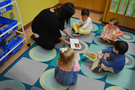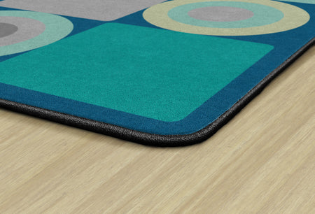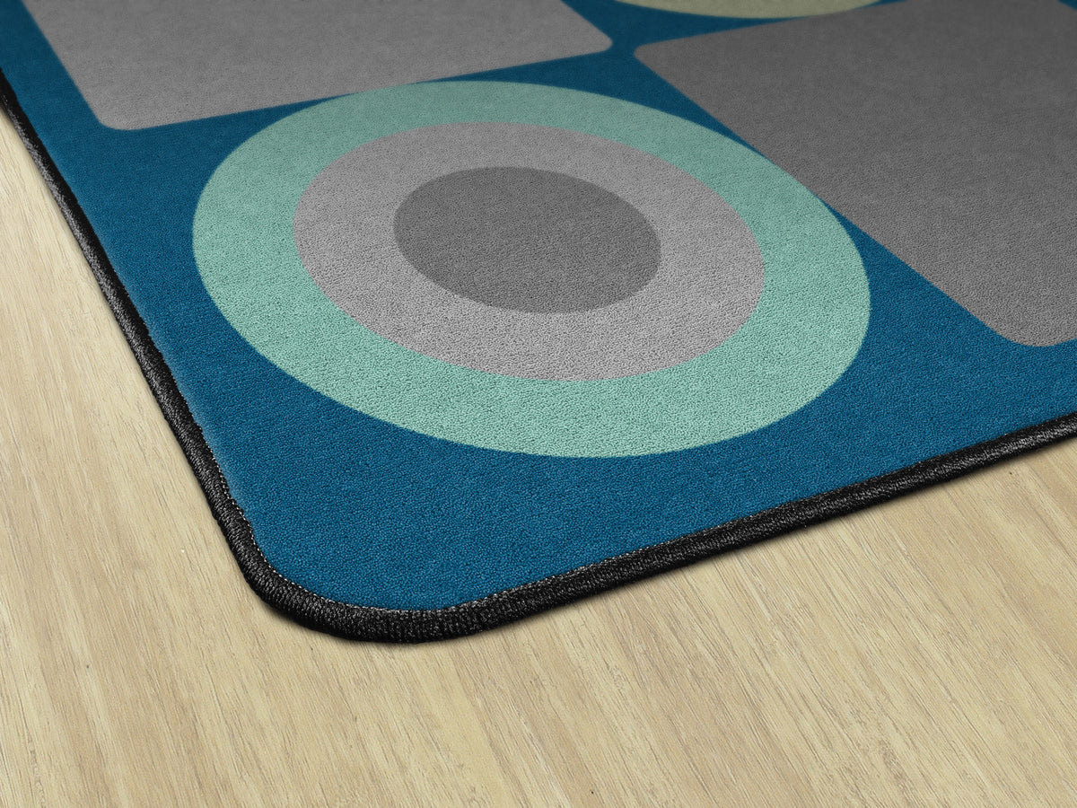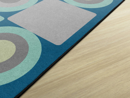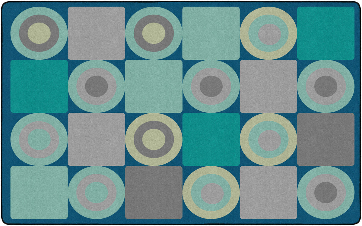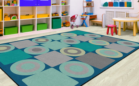 This classroom rug features a playful grid of alternating squares and circles in calming shades of teal, grey, and soft yellow. The modern geometric pattern adds a fun yet orderly touch to the space, making it perfect for seating spots, group activities, or bringing a fresh contemporary vibe to any learning space.