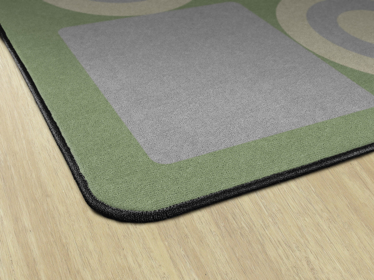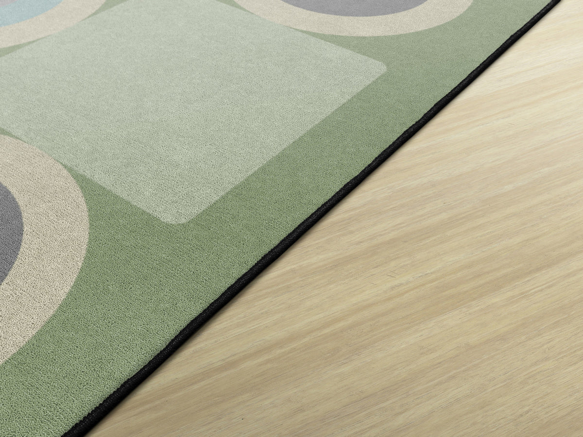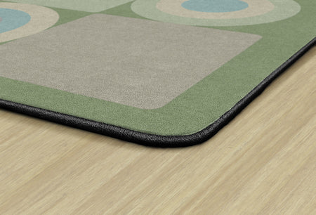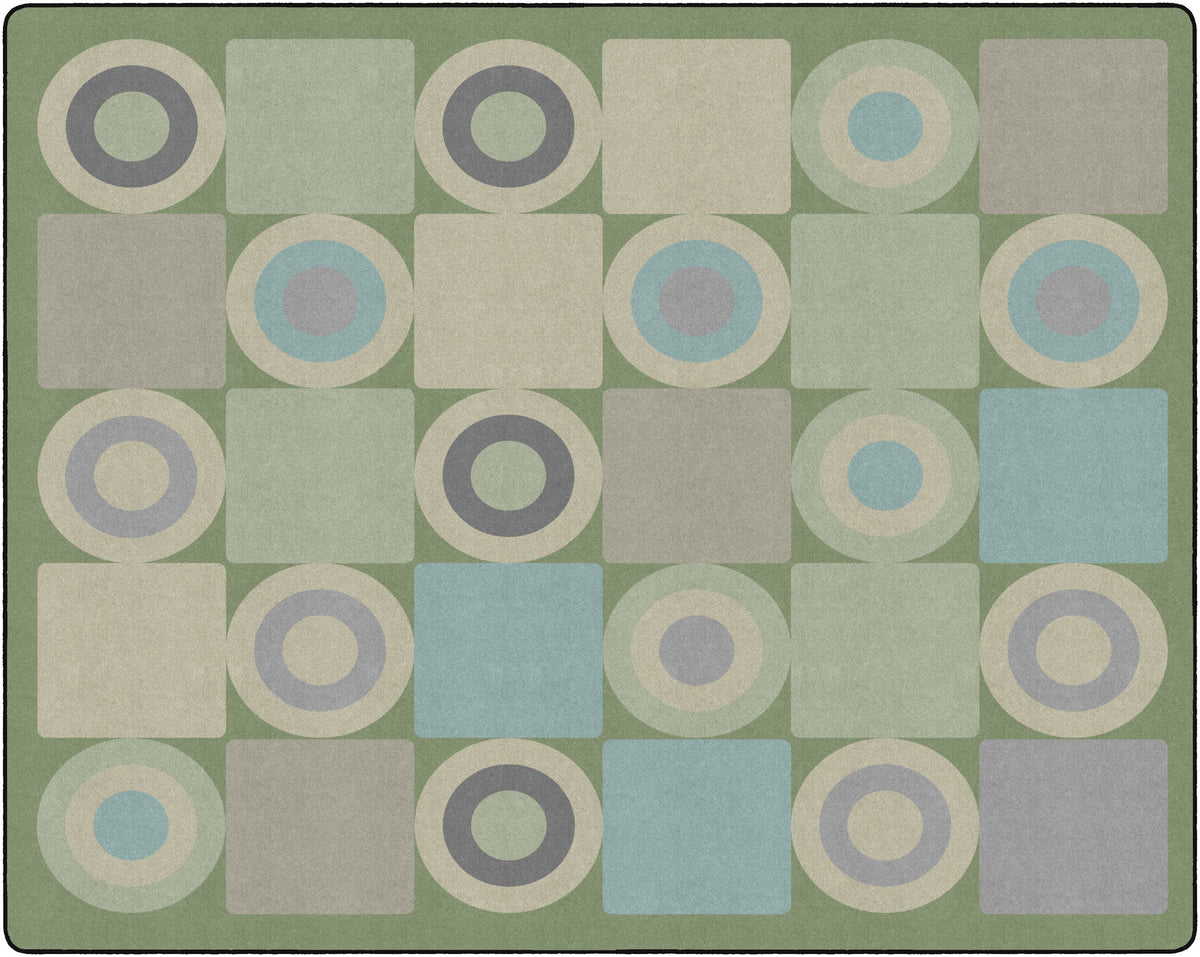This classroom rug features a playful grid of alternating squares and circles in calming shades of green, grey, and beige. The modern geometric pattern adds a fun yet orderly touch to the space, making it perfect for seating spots, group activities, or bringing a fresh contemporary vibe to any learning space.