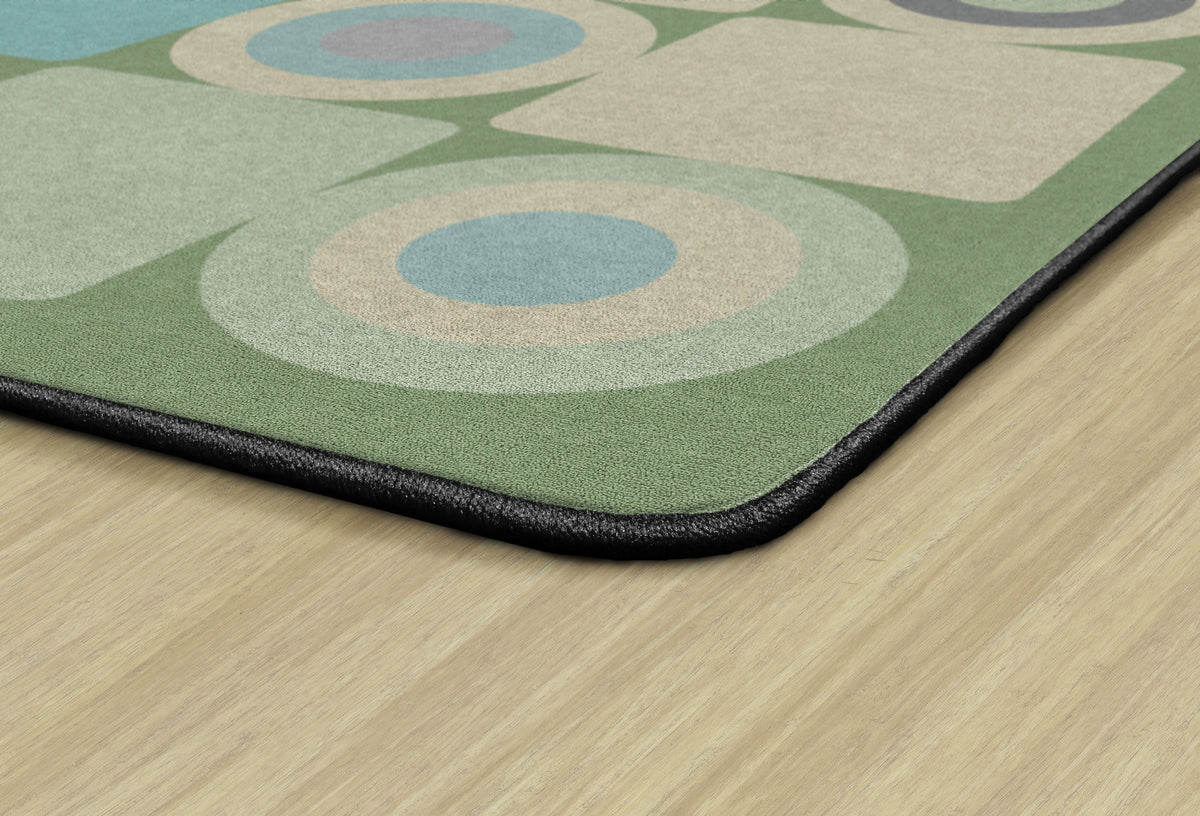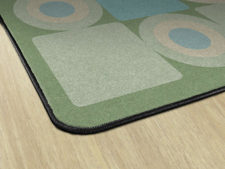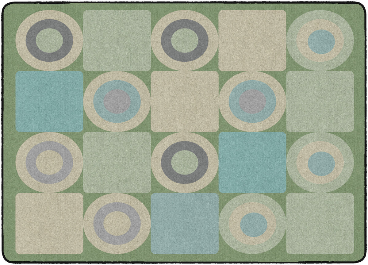 This classroom rug features a playful grid of alternating squares and circles in calming shades of green, grey, and beige. The modern geometric pattern adds a fun yet orderly touch to the space, making it perfect for seating spots, group activities, or bringing a fresh contemporary vibe to any learning space.