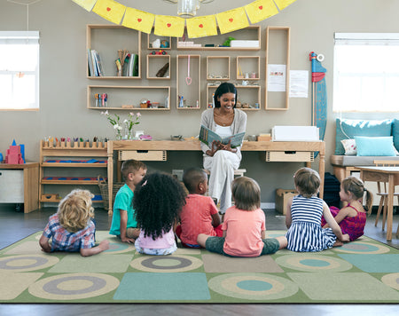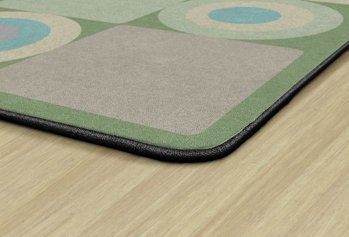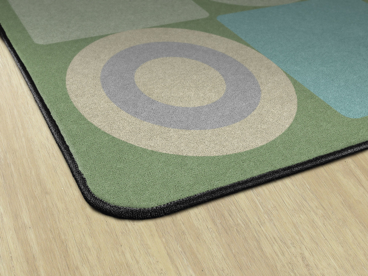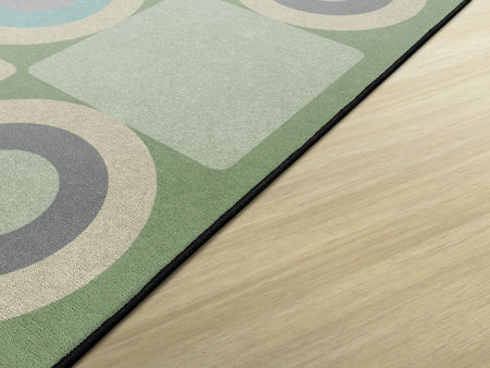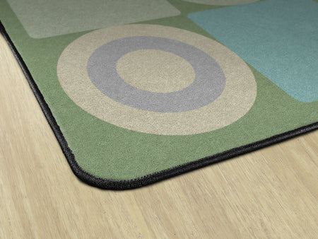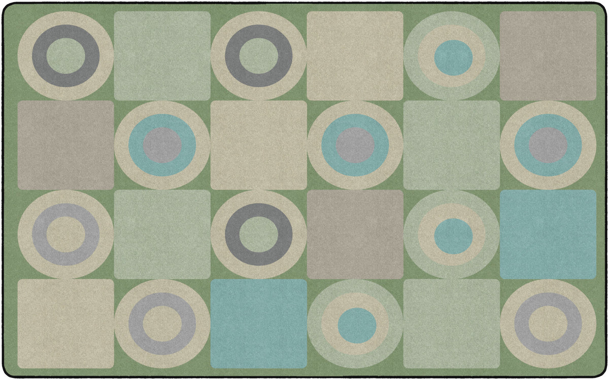 This classroom rug features a playful grid of alternating squares and circles in calming shades of green, grey, and beige. The modern geometric pattern adds a fun yet orderly touch to the space, making it perfect for seating spots, group activities, or bringing a fresh contemporary vibe to any learning space.