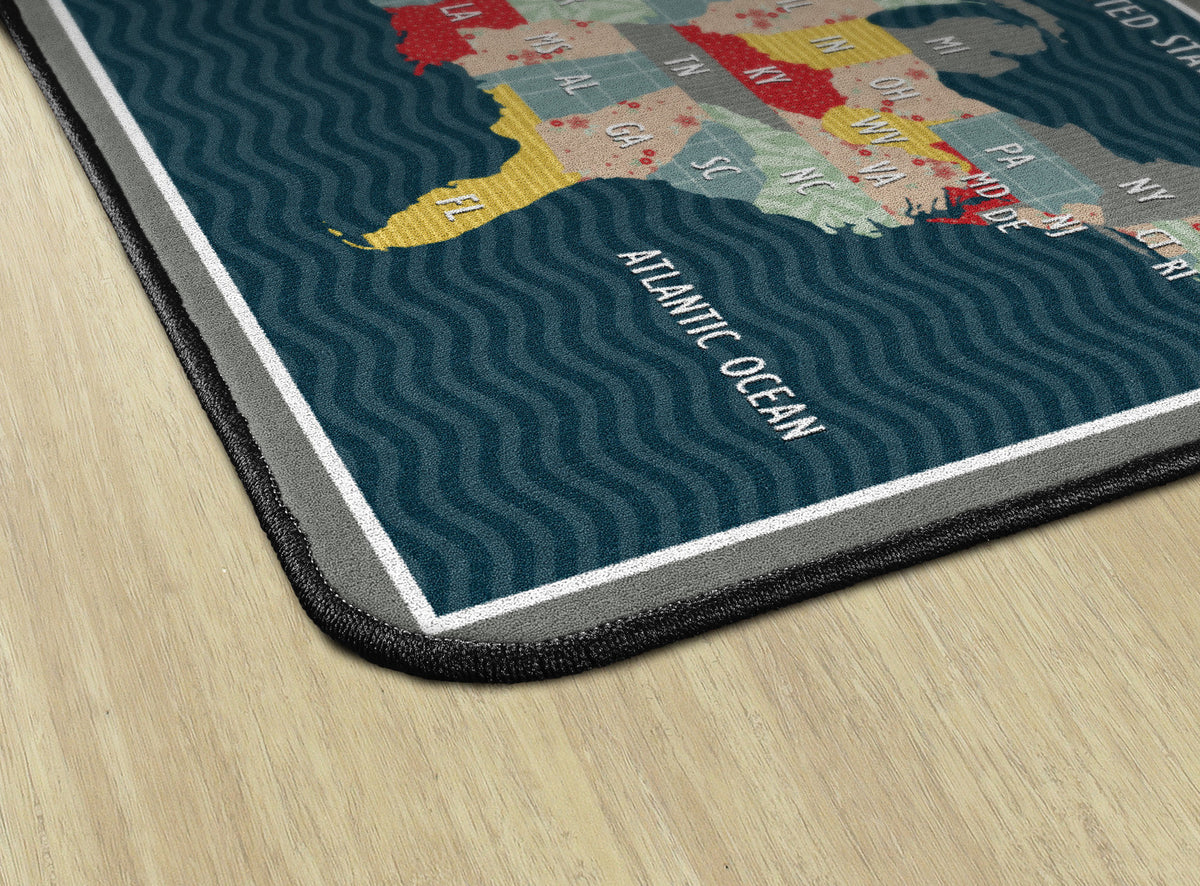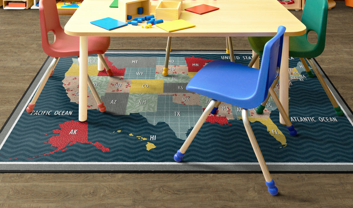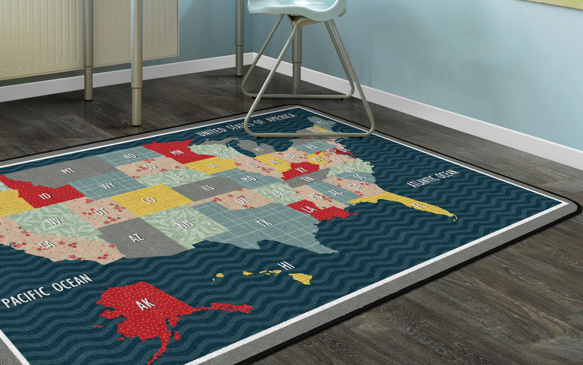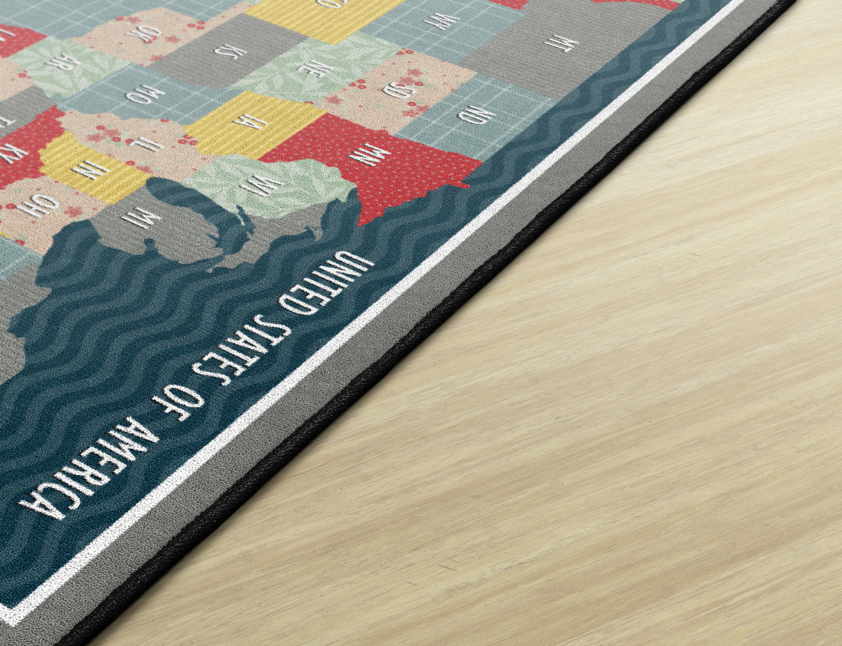 Bring a cozy farmhouse feel to any classroom, playroom, daycare, or child's bedroom with this cute United States map educational rug. With a collage of fun patterns and vivid colors, this rug will make school feel like home! This rug has a durable and sturdy backing to maintain its appearance in high traffic areas.