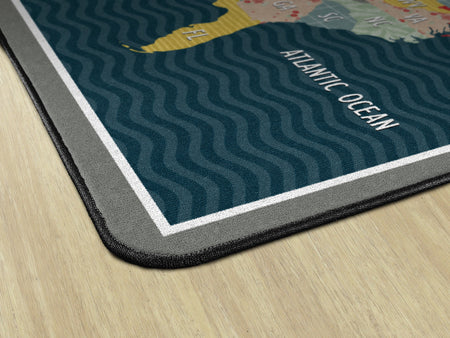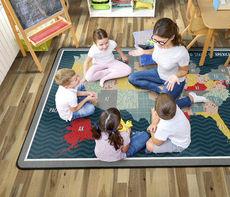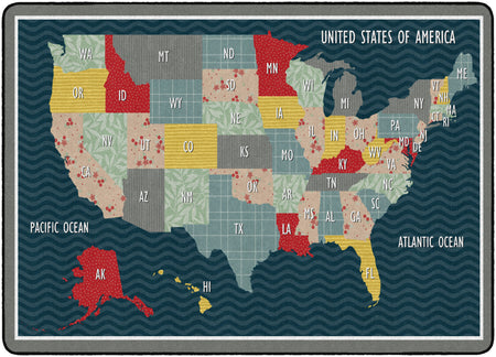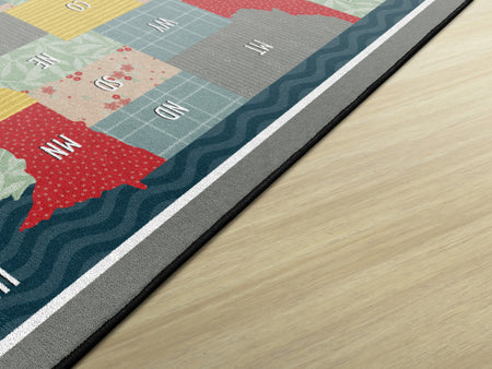 Bring a cozy farmhouse feel to any classroom, playroom, daycare, or child's bedroom with this cute United States map educational rug. With a collage of fun patterns and vivid colors, this rug will make school feel like home! This rug has a durable and sturdy backing to maintain its appearance in high traffic areas.