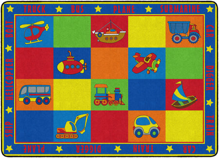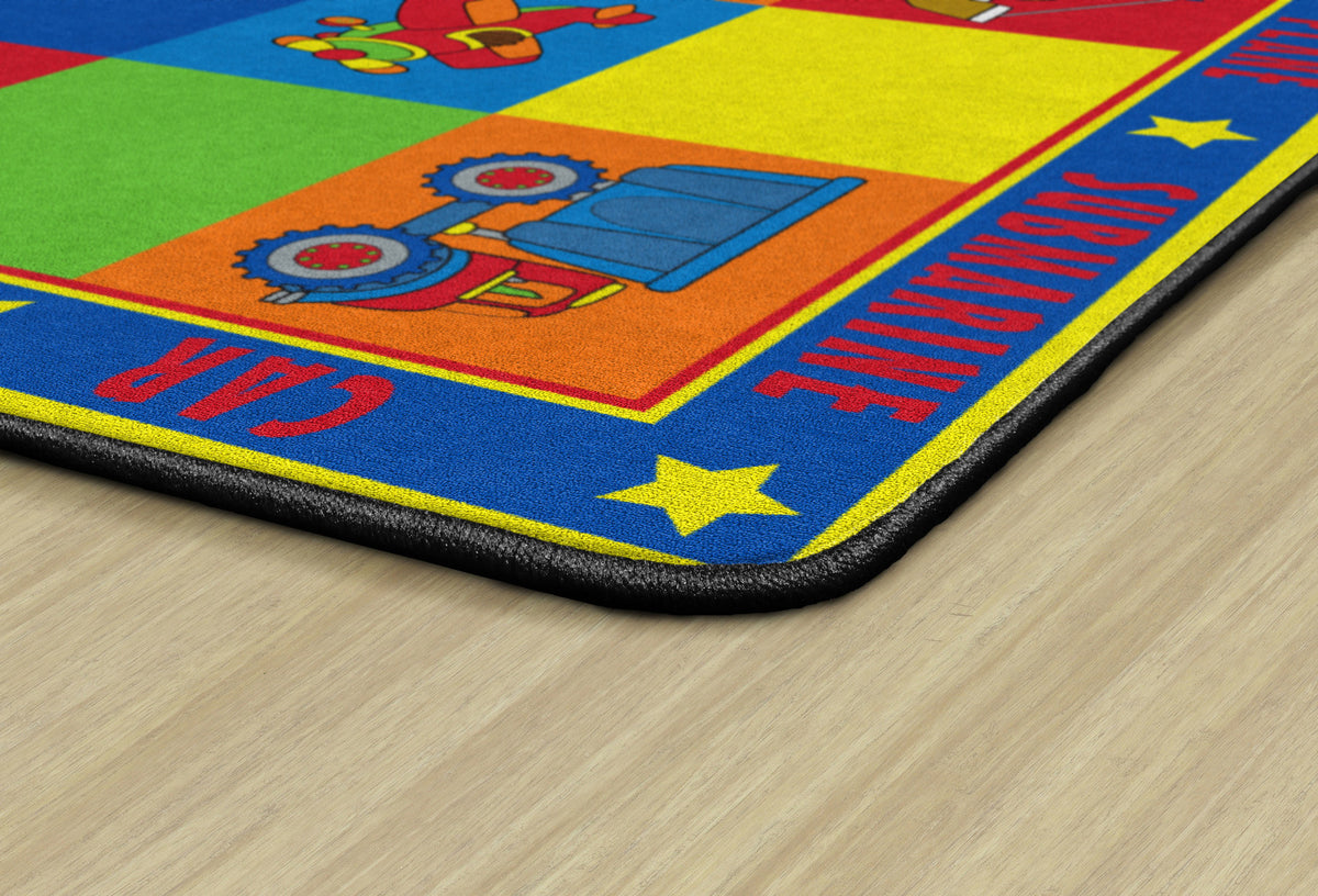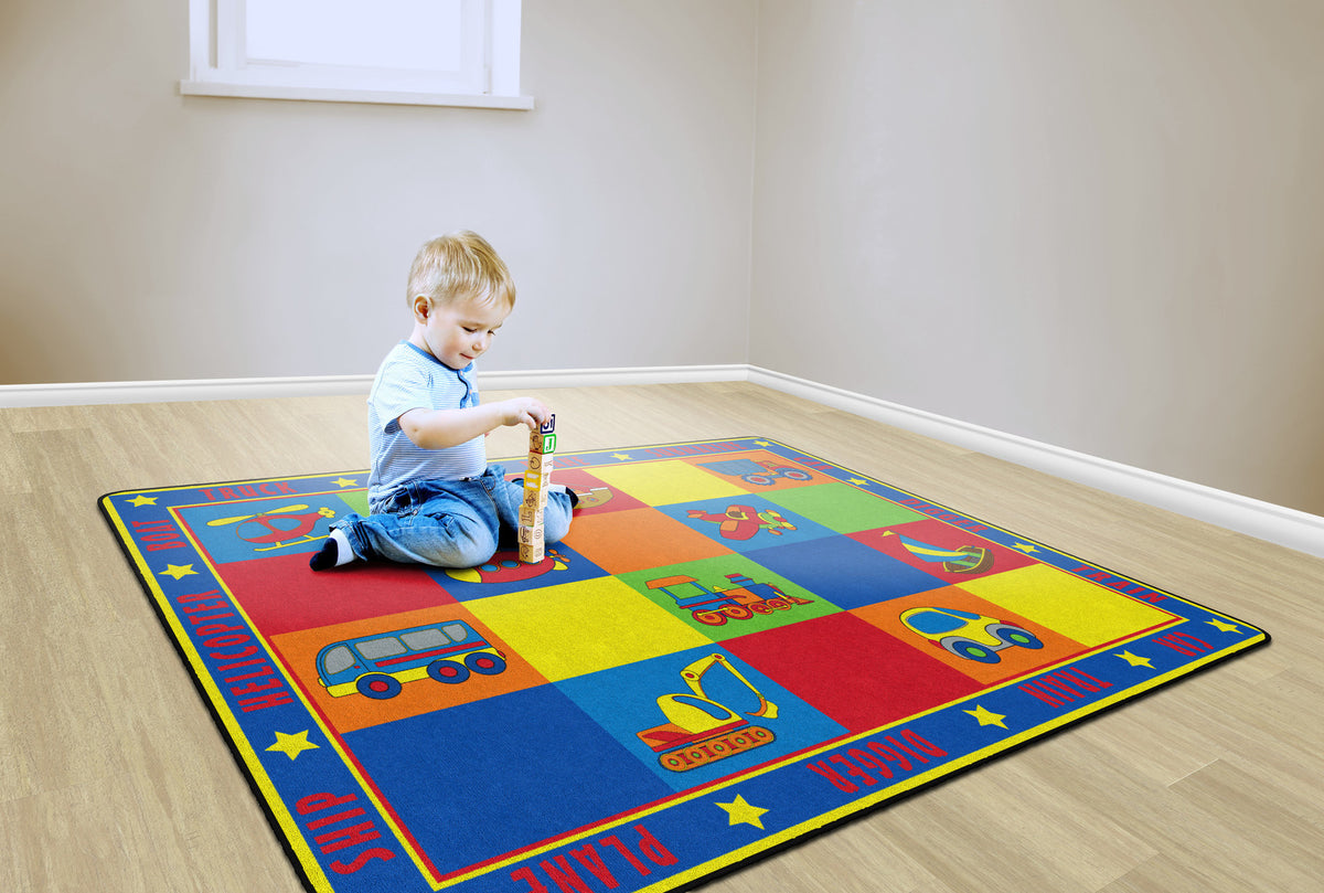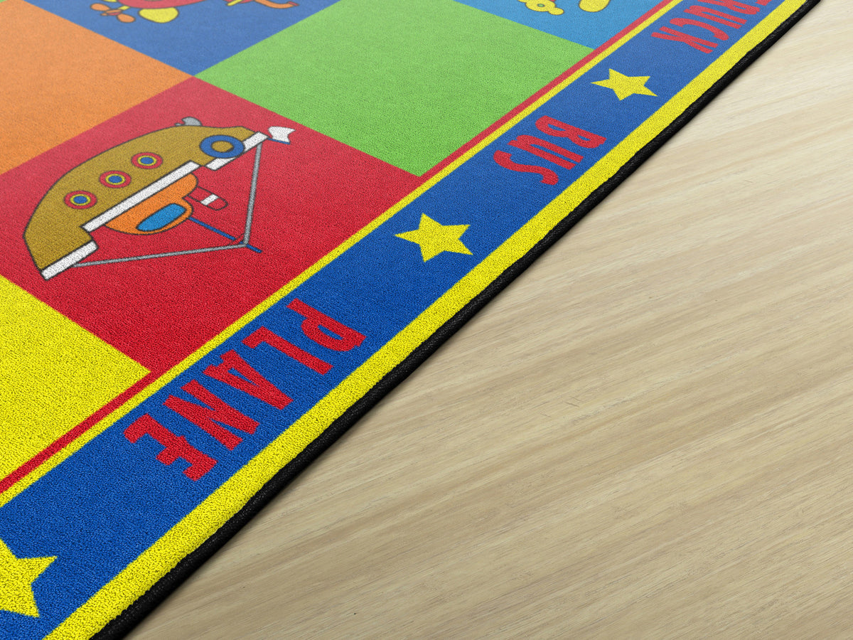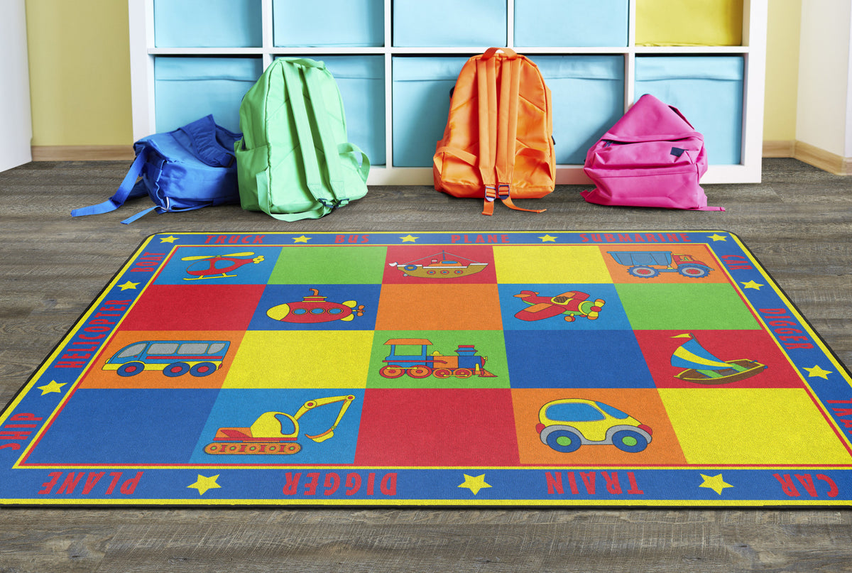 Vehicle Seating is a patchwork of colorful squares that provides enough seating space for 20 kids or less.