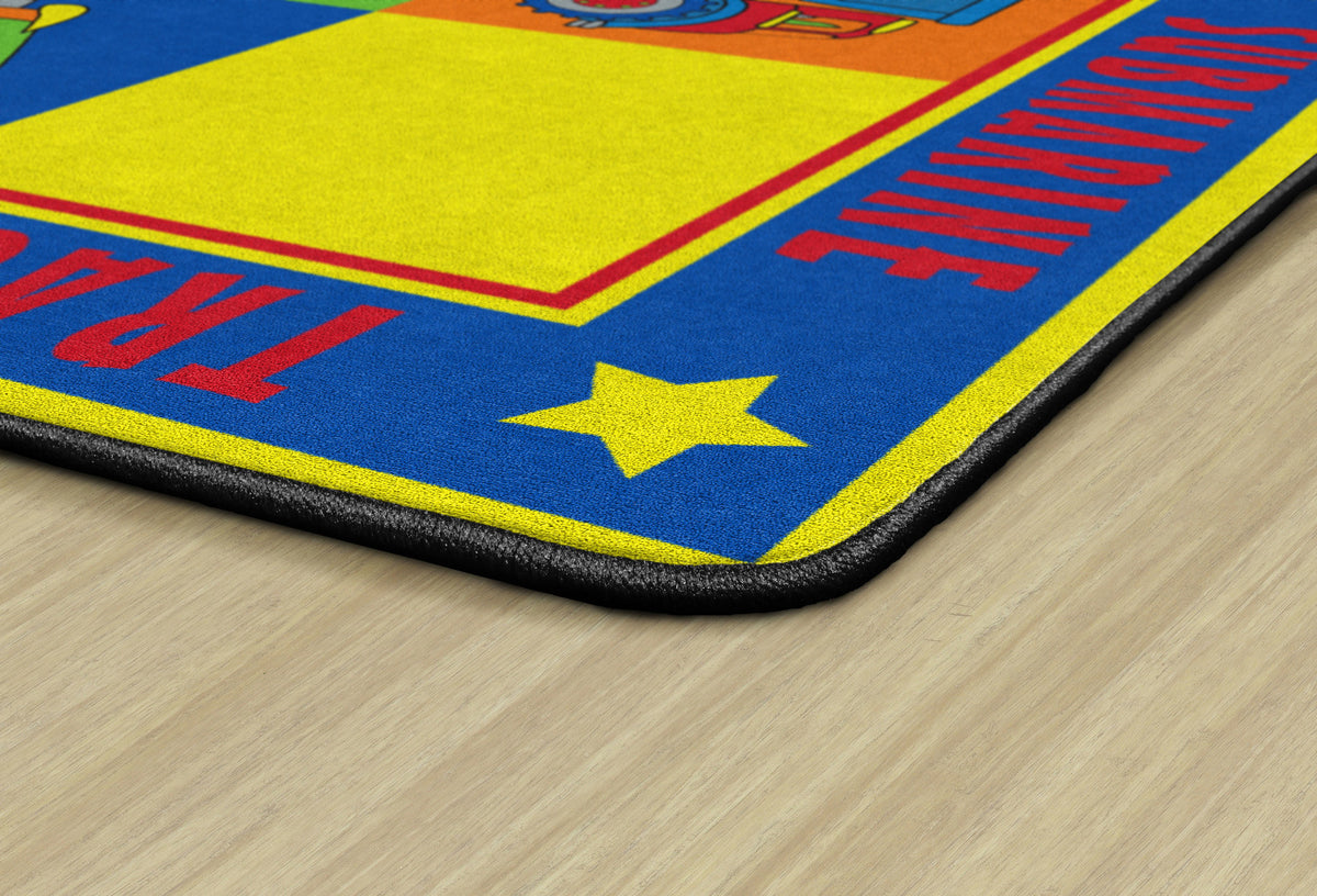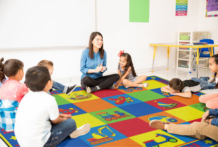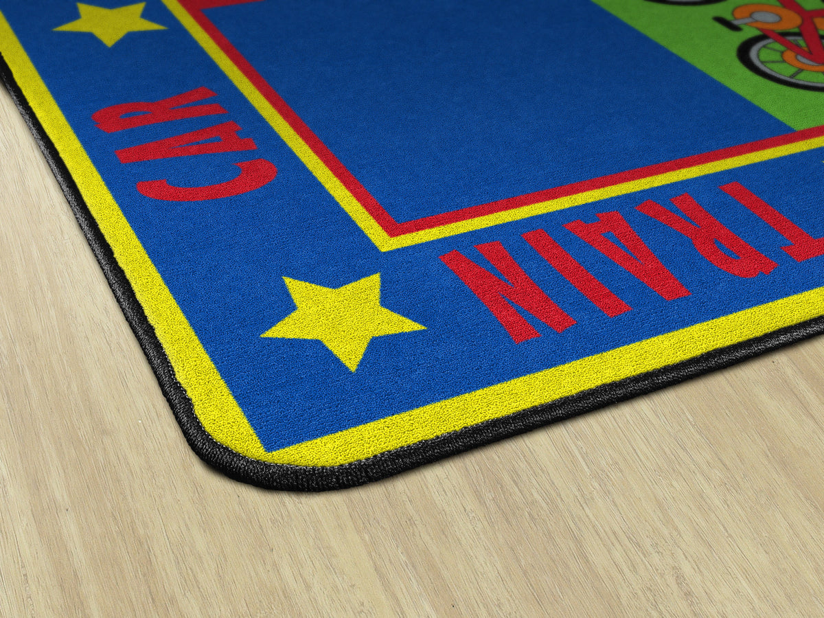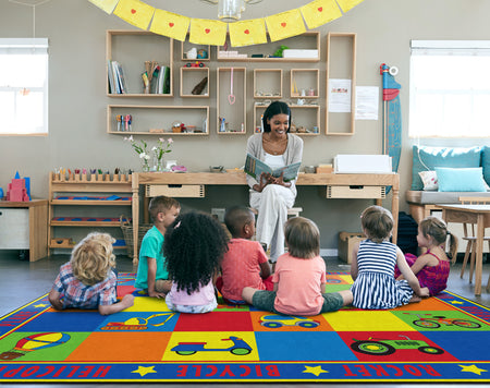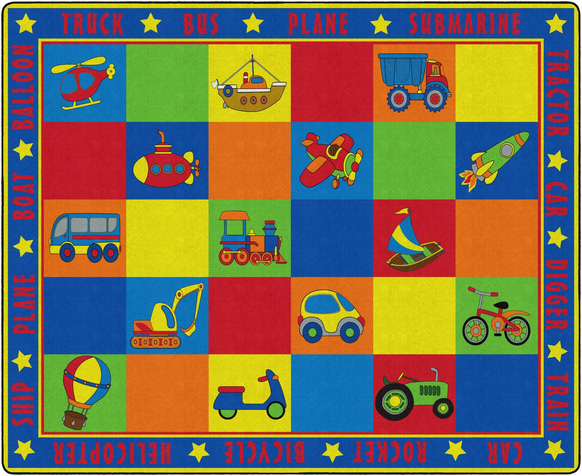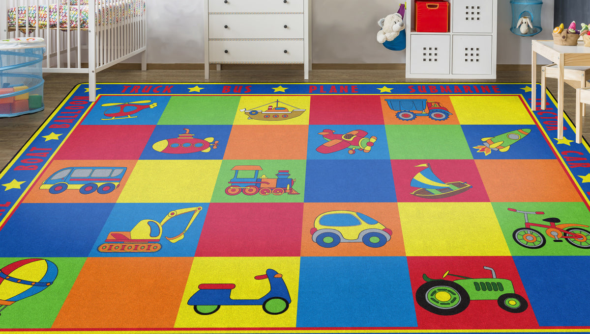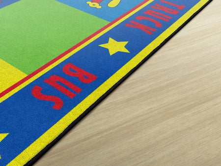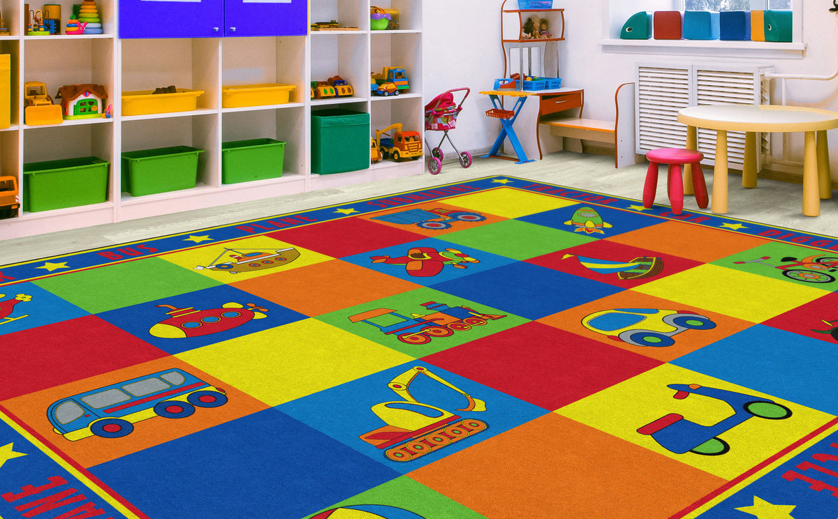 Vehicle Seating is a patchwork of colorful squares that provides enough seating space for 20 kids or less.