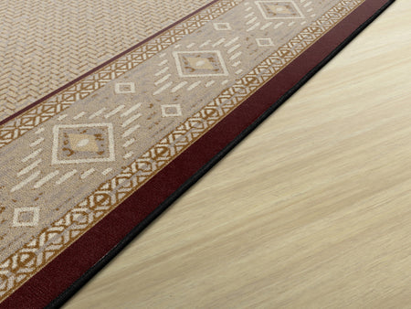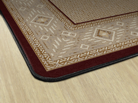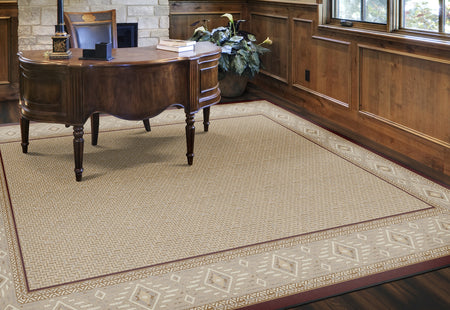 This rug features a rustic border pattern that surrounds a woven, sisal-look center.
