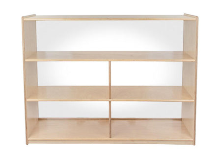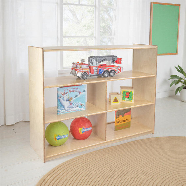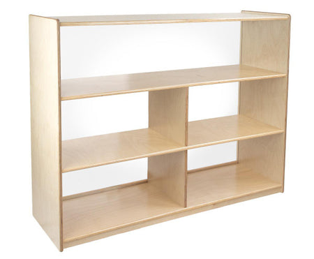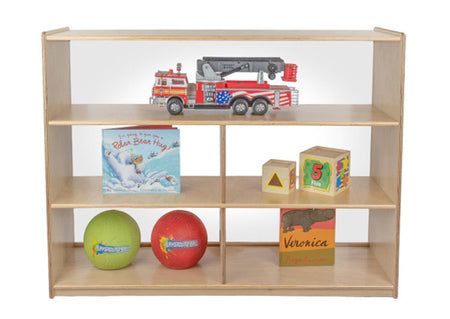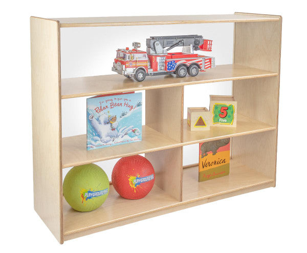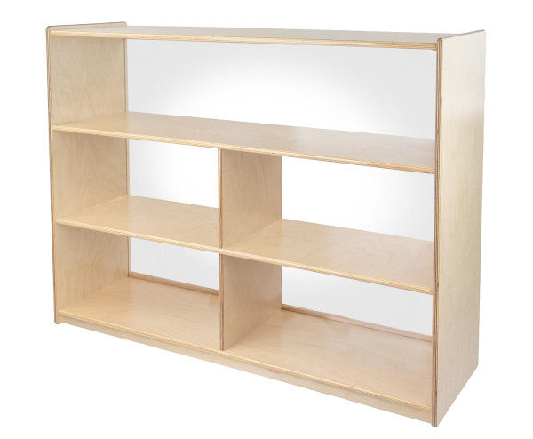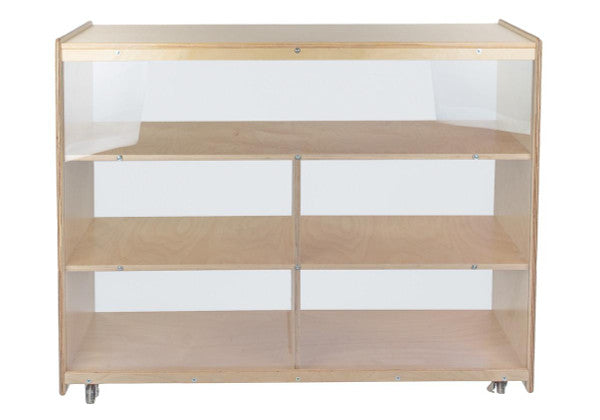 GREENGUARD Gold certified. Our acrylic back units keep the classroom open and visually stimulating to encourage children's natural development. Full length open shelf provides a variety of storage options. Constructed from Birch Plywood, and coated with our exclusive Tuff-Gloss™ UV finish. A recessed back for added strength, stability, and beauty. Fully rounded corners and edges for maximum safety. 38"H x 48"W x 15"D. Fully assembled on locking casters. Lifetime warranty. Made in the U.S.A.