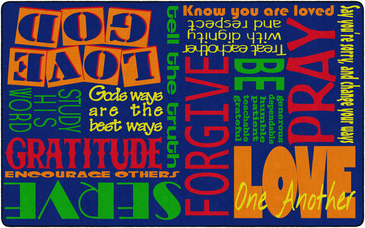This rug features encouraging words of wisdom to help us "Walk His Way" through the journey of life. This rug is perfect for any home, christian school classroom, or church classrooom.