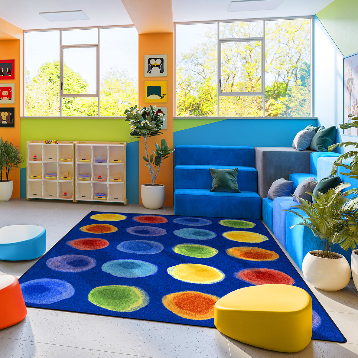 Watercolor Spots utilizes dramatic watercolor blooms organized in rows to create an unexpected interpretation of the classic organizational rug. Children will be drawn to the bright, blended layers of color and will be eager to spend time sitting, learning and playing on this colorful classroom carpet. Size 10'9" x 13'2" Rug is certified Green Label Plus for the highest standard in indoor air quality Manufactured with premium WearOn® Nylon for lasting beauty and durability in high-traffic areas Class I Flammability Rating Lifetime limited wear and texture retention warranty Lifetime antistatic protection
