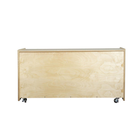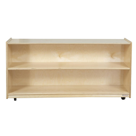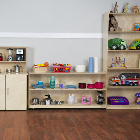 GREENGUARD Gold certified. Long shelves provide abundant storage options. Constructed from Birch Plywood, and coated with our exclusive Tuff-Gloss™ UV finish. A recessed back for added strength, stability, and beauty. Fully rounded corners and edges for maximum safety. 23 1/2"H x 58"W x 15"D. Fully assembled on locking casters. Lifetime warranty. Made in the U.S.A.