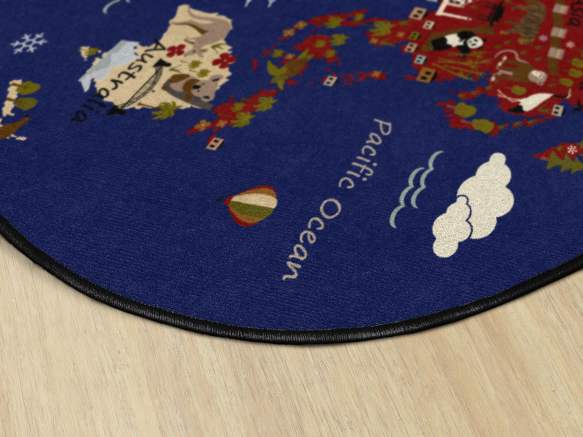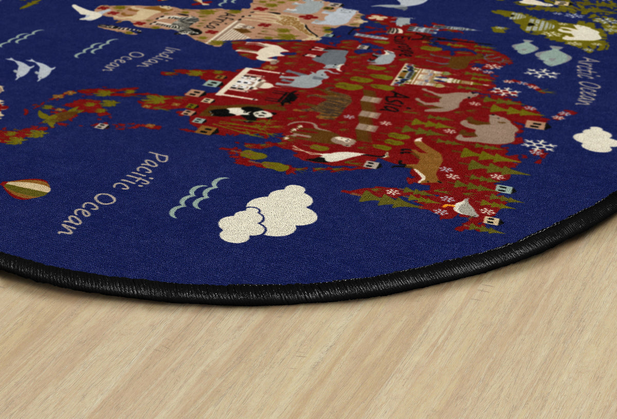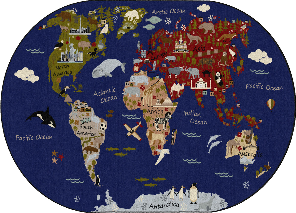 Students will love traveling around the world and identifying familiar images on each continent with this fun educational rug. Perfect for any daycare, playroom, preschool, or classroom, children will learn about habitats and landmarks around the world. With stain resistance, this oval carpet will maintain its appearance even in high traffic areas, and double-stitched edges won’t unravel. Made in USA