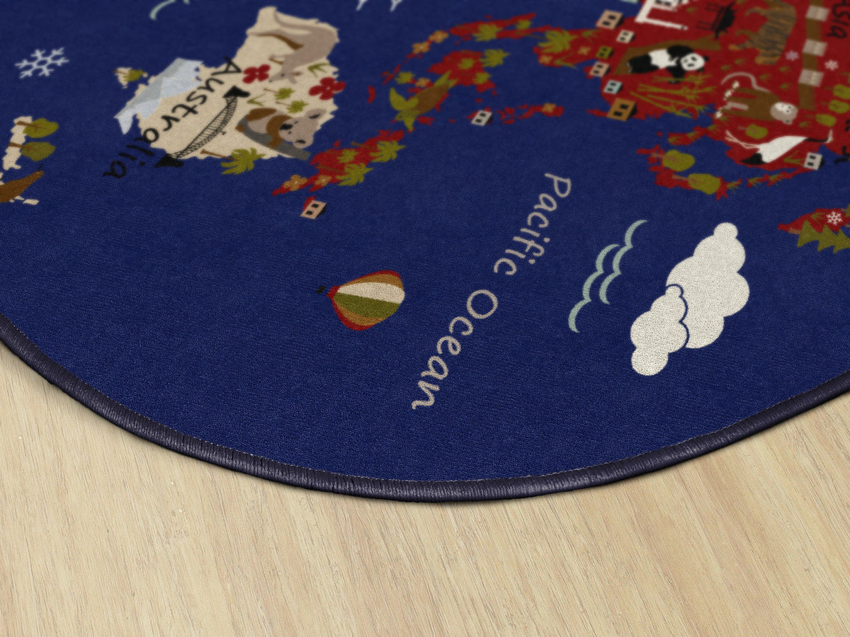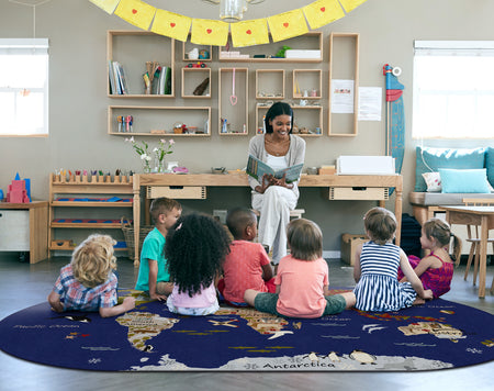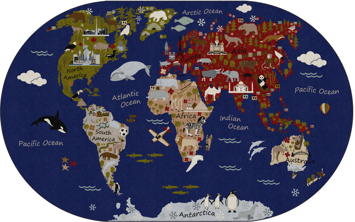Students will love traveling around the world and identifying familiar images on each continent with this fun educational rug. Perfect for any daycare, playroom, preschool, or classroom, children will learn about habitats and landmarks around the world. With stain resistance, this oval carpet will maintain its appearance even in high traffic areas, and double-stitched edges won’t unravel.