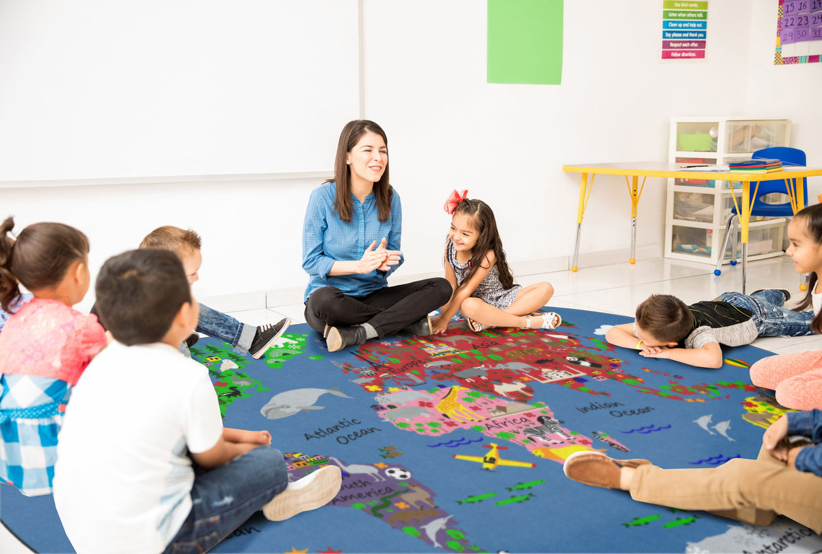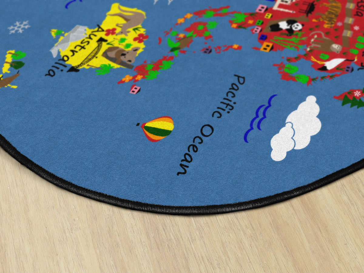 Students will love traveling around the world and identifying familiar images on each continent with this fun educational rug. Perfect for any daycare, playroom, preschool, or classroom, children will learn about habitats and landmarks around the world. With stain resistance, this oval carpet will maintain its appearance even in high traffic areas, and double-stitched edges won’t unravel.