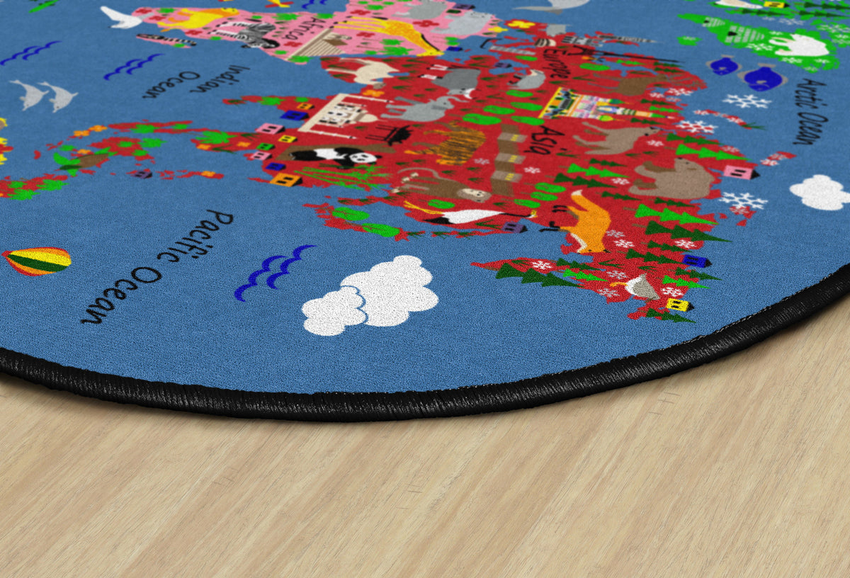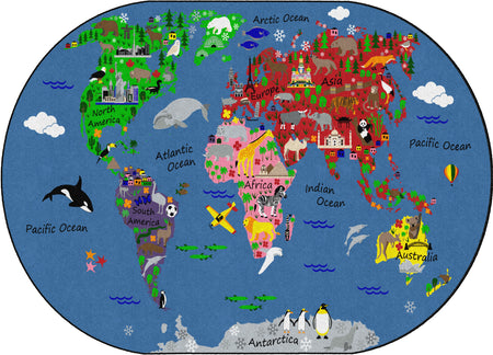 Students will love traveling around the world and identifying familiar images on each continent with this fun educational rug. Perfect for any daycare, playroom, preschool, or classroom, children will learn about habitats and landmarks around the world. With stain resistance, this oval carpet will maintain its appearance even in high traffic areas, and double-stitched edges won’t unravel. Made in USA