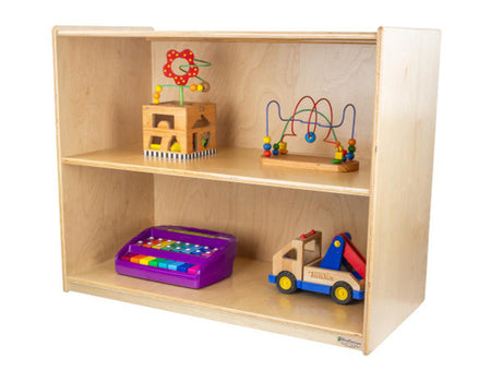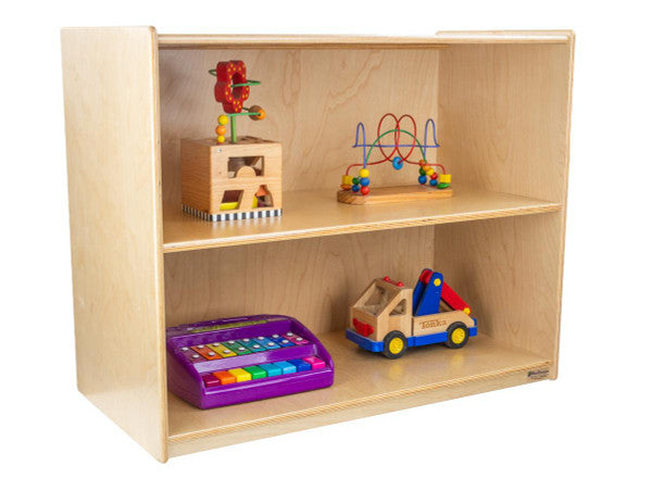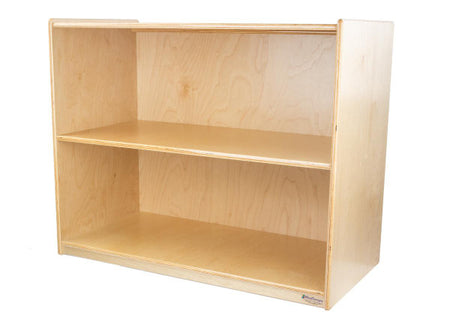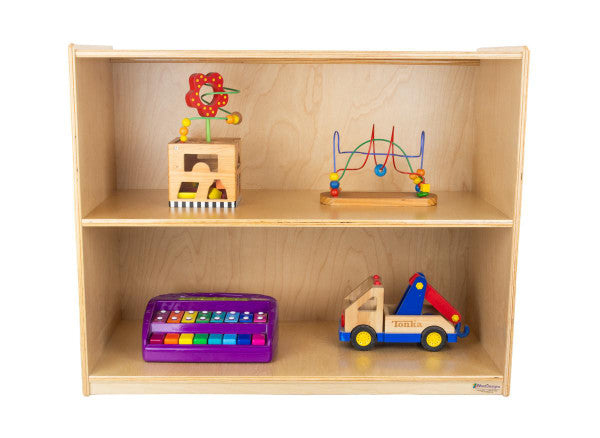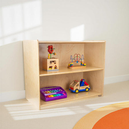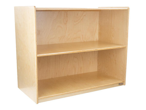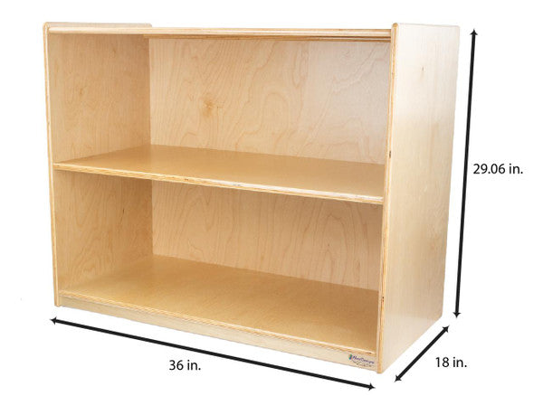 GREENGUARD Gold certified. Attractive bookshelf provides versatility in every room with (2) fixed shelves that have plenty of space for books, puzzles & more. Constructed from Birch Plywood, and coated with our exclusive Tuff-Gloss™ UV finish. A recessed back for added strength, stability, and beauty. Fully rounded corners and edges for maximum safety. 29-1/16"H x 36"W x 18"D. Fully assembled. Lifetime warranty. Made in the U.S.A.