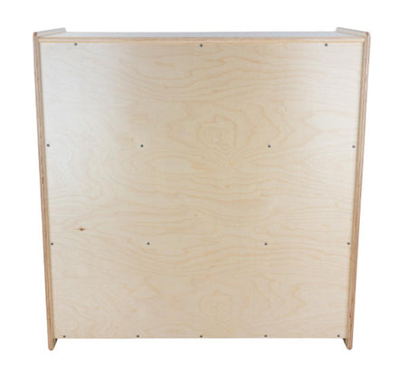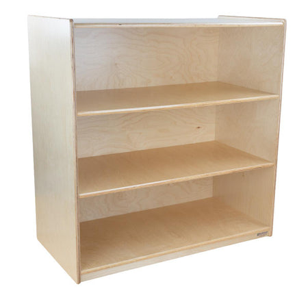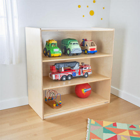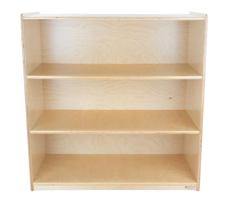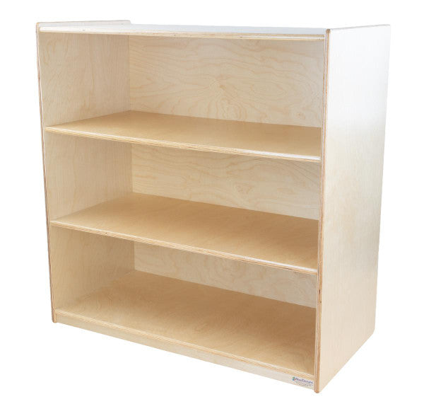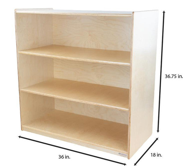 GREENGUARD Gold certified. Attractive bookshelf provides versatility in every room with (3) fixed shelves that have plenty of space for books, puzzles & more. Constructed from Birch Plywood, and coated with our exclusive Tuff-Gloss™ UV finish. A recessed back for added strength, stability, and beauty. Fully rounded corners and edges for maximum safety. 36-3/4"H x 36"W x 18"D. Fully assembled. Lifetime warranty. Made in the U.S.A.