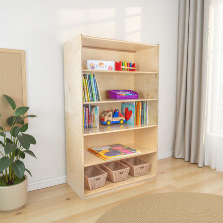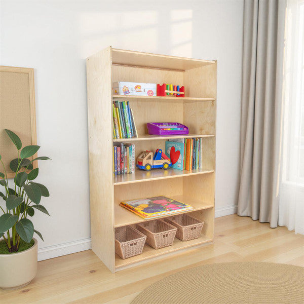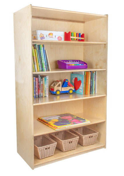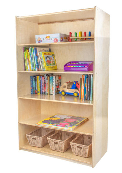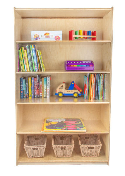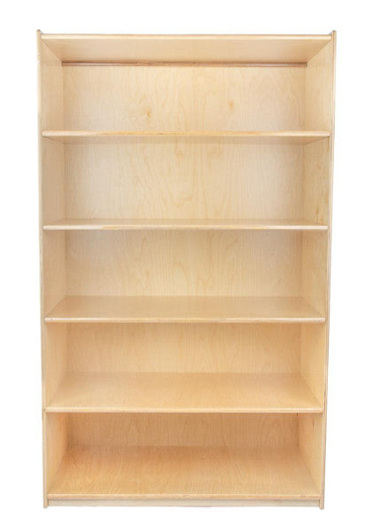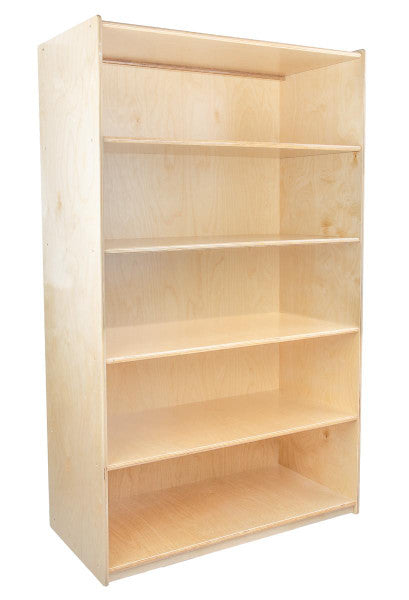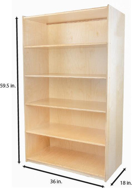 GREENGUARD Gold certified. Attractive bookshelf provides versatility in every room with (5) fixed shelves that have plenty of space for books, puzzles & more. Constructed from Birch Plywood, and coated with our exclusive Tuff-Gloss™ UV finish. A recessed back for added strength, stability, and beauty. Fully rounded corners and edges for maximum safety. 59-1/2"H x 36"W x 18"D. Fully assembled. Lifetime warranty. Made in the U.S.A.