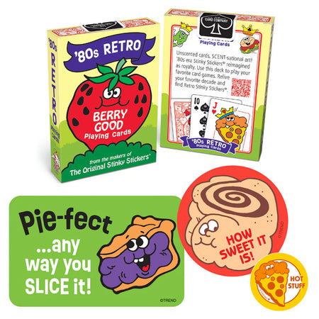 Relive your best-loved decade! This set includes one pack of '80s Retro Playing Cards plus five '80s Retro-themed vinyl sticker packs, and nine '80s Retro-themed scented sticker packs. Vinyl stickers have 2 or 3 pieces per pack, with sizes from 2-3/8" to 3-3/4". TREND Retro Stinky Stickers are 1-1/4" diameter, and scents include strawberry, root beer, popcorn, chocolate, hot dog, pizza, fruit pie, watermelon, and cinnamon roll. Recommended age 6+ years