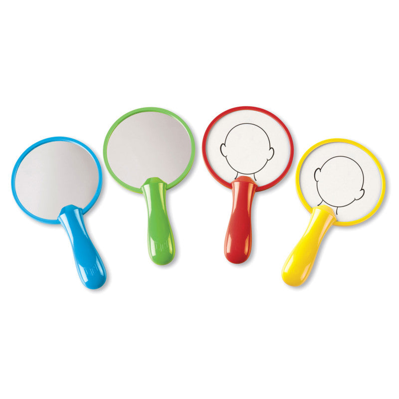 Build self-awareness! Handheld boards feature the outline of a face on the write & wipe side and a mirror on the reverse. Children look at their reflections and then draw matching facial features on the outlined face. Great for About Me themed lessons. Set includes 4 mirrors, each measuring 5" in diameter. Grades PreK+. Recommended age 3+ years