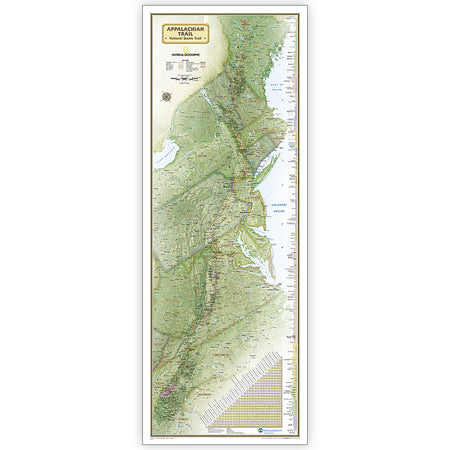 Expertly researched and designed, National Geographic's map of the Appalachian Trail is ideal for fans and hikers of this magnificent national scenic trail. It makes a great planning tool or as reference to track progress on the 2,200 mile length. Developed in cooperation with the Appalachian Trail Conservancy, this beautiful poster, shows the entire length of the trail from Maine to Georgia. A unique elevation profiles highlight the trail's peaks and valleys and an informative mileage chart shows the distance between key locations. Also highlighted on the map are National Forests, National Park Service lands, State Forests and Parks, and major highways and interstates. Points of interest include Appalachian Trail information centers and shelters.