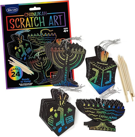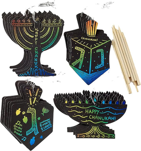 Chanukah fun for everyone! Entertain & educate kids of all ages (yes, adults too!), with these Chanukah themed, ready-to-hang scratch cards. Budding artists simply scratch along the preprinted outlines and the bright, vibrant colors beneath will bring the project to life. Perfect for classes, groups and everyone who loves artistic projects!