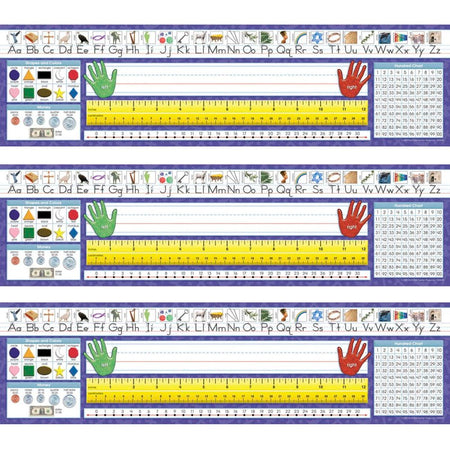 Christian Primary Traditional Manuscript Desk Plates include photo alphabet line featuring Biblical images and symbols, name plate with left and right handprints, 12" (30 cm) ruler, number line (0 to 30), shapes and colors, U.S. currency, and hundred chart. Each pack includes 36 desk plates. Sold as 3 packs for a total of 108 desk plates. Recommended age 4-7 years