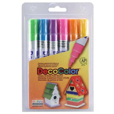 Use these DecoColor® Broad Point paint marker pen to write out large messages on glass or mirrors or to cover a larger surface area on other projects. The larger tip of this paint pen allows for a quick covering of any glass, paper, wood, clay, porcelain, stone, metal, or mirror surface. The paint is acid-free, lightfast, weatherproof, and pigmented. Each pack includes 6 markers, 1 each of yellow, orange, light blue, light green, rosemarie, and hot purple. Recommended age 5+ years