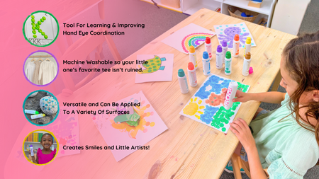 Sponge tip applicator makes painting fun and easy with no cups, no brushes, and no mess. Washable formula ink dries quickly. 2. 5 oz. spill-proof bottles. Nontoxic. Made in the USA.