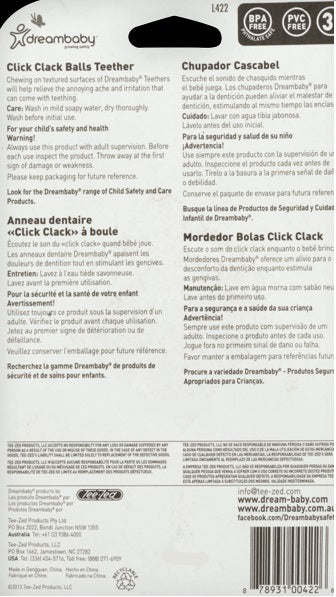 Dreambaby® Click Clack Balls Teether 3+ Months. Chewing on textured surfaces of dreambaby teethers will help relieve the annoying ache and irritation that can come with teething. This is a non-toxic product. It is phthalate safe and free from PVC and BPA.