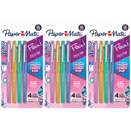 Turn everyday writing into eye candy with the Paper Mate Flair Pens, limited edition Candy Pop pack! Scrumptious candy-inspired shades plus smear-resistant ink that won't bleed through the page combine to give all your drawings, doodles and projects a pop of indulgent color. Flair pens have a medium point (0.7mm) that writes in bold, colorful lines along and a Point Guard that prevents the tip from fraying. Treat yourself to bold, fun, excitingly sweet sketching and writing with Paper Mate felt tip colored pens. Each pack includes 4 pens. Sold as 3 packs for a total of 12 pens. Recommended age 5+ years