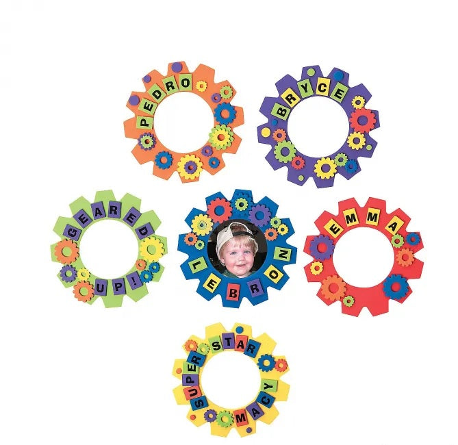These Gear-Shaped Picture Frame Magnet Crafts let students showcase their favorite photos in a custom picture frame. Includes self-adhesive foam. 5" diam. with 2-1/2" diam. photo space. Makes 24. Kit includes instructions and extra pieces. Makes 24 Projects. Ages 3 +