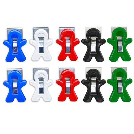 The strong magnet holds even heavy items easily and securely. Attach to filing cabinets, refrigerators and any other magnetic surface. Sturdy clip holds papers, notes, signs and more. Fun person-shape. Sold as a pack of 10 in assorted colors (no color choice).