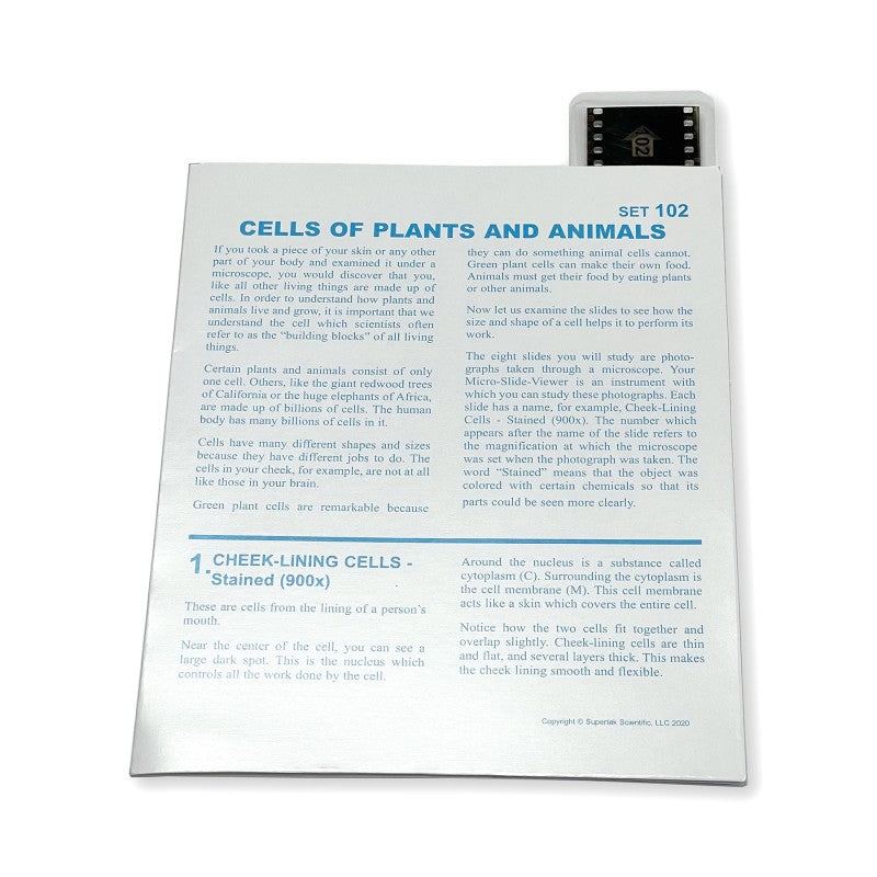 This Microslide, Cells of Plants and Animals, includes a slide featuring 8 related 35mm images photographed through a microscope called photomicrographs. Arrows and call outs help the student locate important features. This Microslide is accompanied by a detailed lesson plan designed to stimulate, inform and question students about the topic under study, and has a pocket in which the Microslide is stored. The following magnified specimens are depicted on the slide: Cheek-lining Cell Onion-Skin Cells, Spirogyra Cell, Amoeba, Green Leaf Cells, Wood Cells, Bone Cells, Brain Cells. Recommended age 7+ years