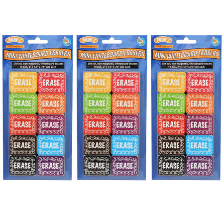 Mini Whiteboard Erasers are designed to wipe out any dry-erase markers. Great for student use. Each eraser measures 2" x 1.5" x 0.75" each. Non-Magnetic. Each pack includes 10 erasers. Sold as a 3 packs for a total of 30 erasers. Recommended age 5+ years