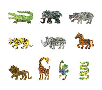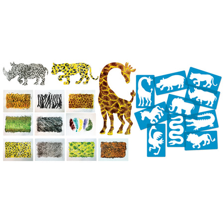 Get ready for an art adventure! 10 safari animal shaped stencils and 10 wild animal skin rubbing plates for making wall decorations, fabric arts, paper crafts and more!