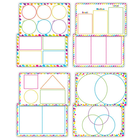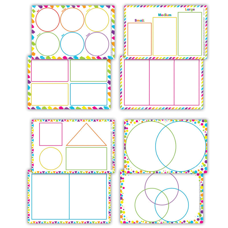 Discover the educational potential of these double-sided and full-color sorting mats. The 8 graphic organizers make learning to sort, classify, categorize, rank, and compare easy with the use of counters, manipulatives, or dry-erase crayons. Designed for both classroom engagement and at-home enjoyment, these mats encourage interactive practice all year long. Easy to clean and sanitize for repeated use. 4 total sorting mats.