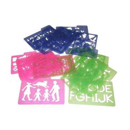 Each stencil is made of durable plastic in fun translucent colors.Comes in a plastic storage box with handle.Comes in a set of 24. A selection of the most popular stencil designs with over 200 images of animals, flowers, letters, people, dinosaurs, holidays, and more. Each stencil is made of durable plastic in fun translucent colors. Comes in a plastic storage box with handle. Set of 24.