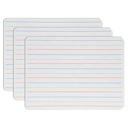 Ideal for teaching and practicing fundamentals for early learners and for use with magnetic manipulatives. Bright white board contains 5 sets of blue headline and broken midline plus red baseline format. Each line set measures 1-1/8" with 3/8" of blank descender space between sets. Back side is magnetic, plain, white dry erase. Boards feature a non-ghosting dry erase surface with rounded corners and smooth edges for comfort and safety. Backing is warp and chip resistant. Measure 12" x 9" x 0.125" thick. Pack of 3 Dry Erase Boards. Recommended age 3+ years
