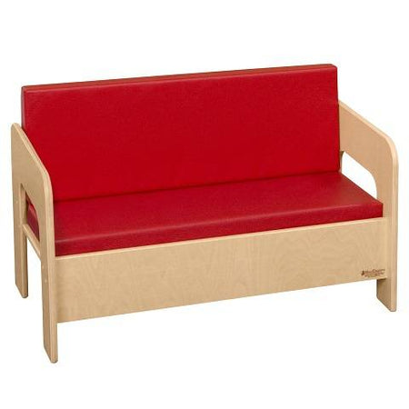 GREENGUARD® Gold certified. Comfortable sofa with (2) red vinyl reversible, interchangeable cushions. Constructed from 100% Plywood, and coated with our exclusive Tuff-Gloss UV finish. Fully rounded corners and edges for maximum safety. 20"H x 30"W x 15-3/4"D. Fully assembled. Lifetime warranty. Made in the U.S.A.